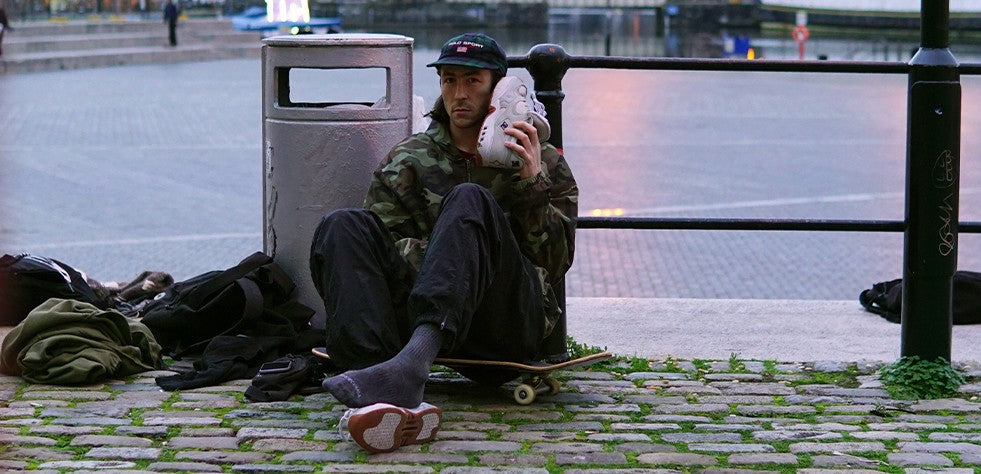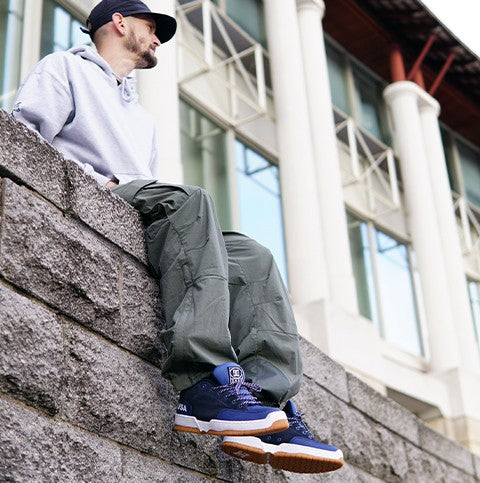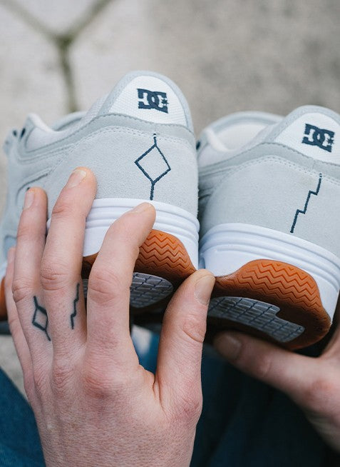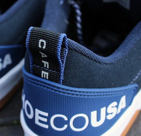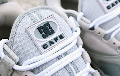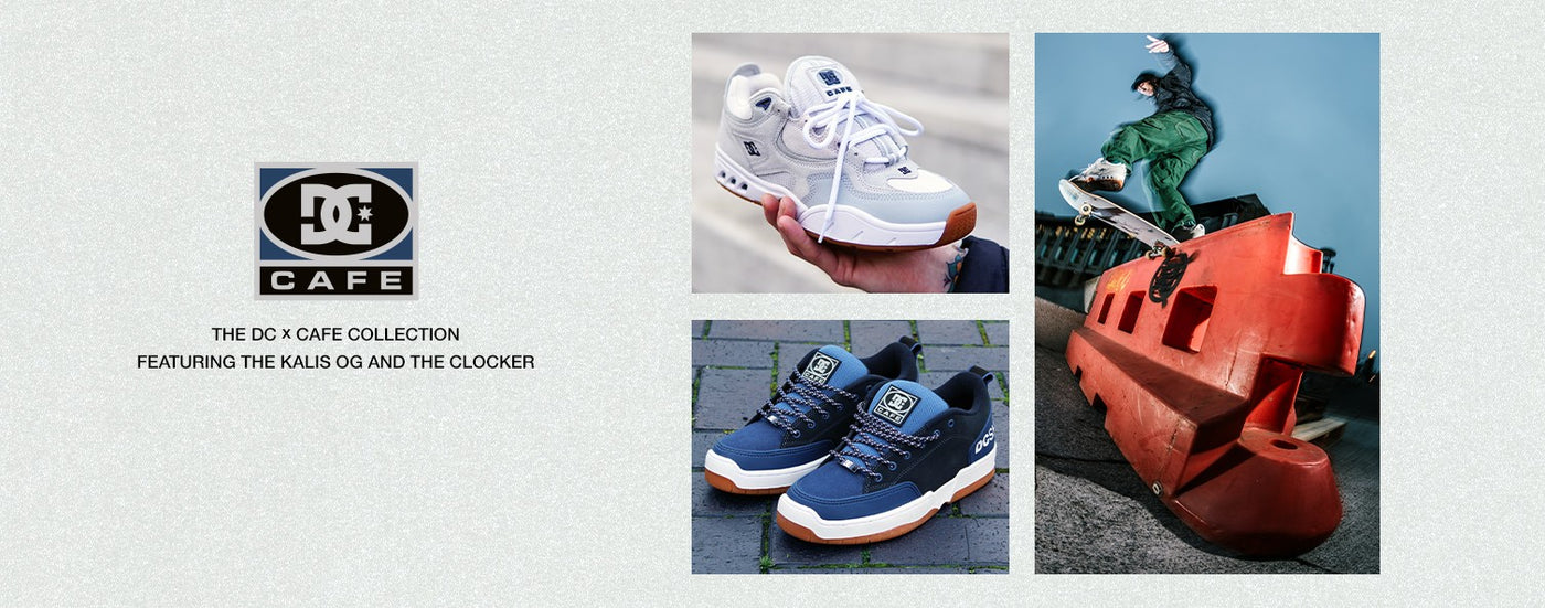 THE CAFE X DC COLLECTION, A COLLABORATION WITH BRISTOL (UK) BRAND CAFE, TAKES INSPIRATION FROM THE ENVIRONMENT AROUND LLOYDS TO CELEBRATE THIS ICONIC SPOT AND SKATE SCENE. THE KALIS OG COLORWAY PAYS HOMAGE TO THE STONE AT LLOYDS WITH THE STAIRS AND DIAMONDS (THE SAME THAT ARE FOUND AT THE SPOT) EMBROIDERED IN THE HEEL. THE BLUES ON THE CLOCKER REPRESENT THE WATER AND BLUE BRICK FOUND AROUND THE PLAZA.
