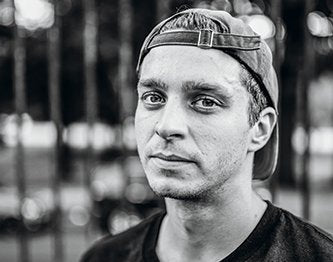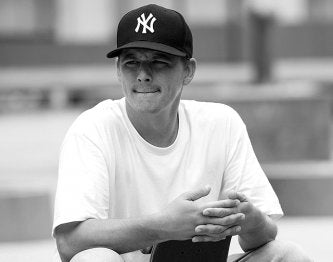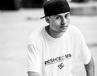 Shintaro Kongo wearing a white t-shirt with 'DC SHOE CO. USA' logo and a blue cap, sitting outdoors.