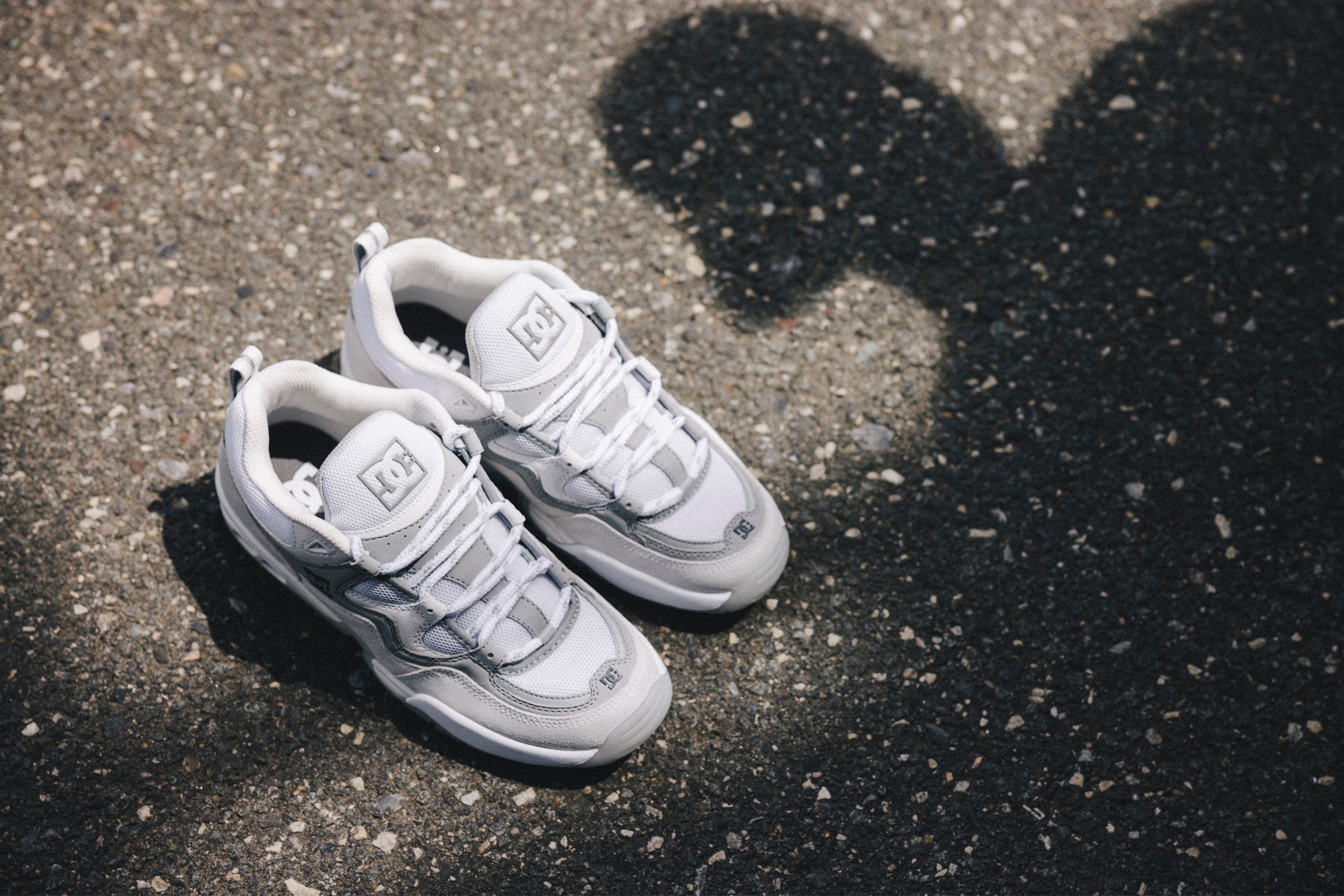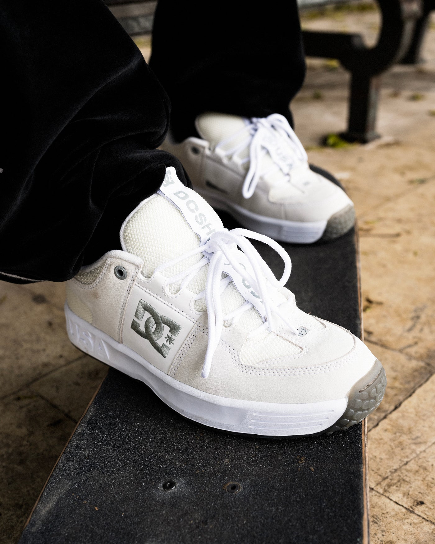 Heritage shoes in white and grey worn by someone with their feet on a skateboard