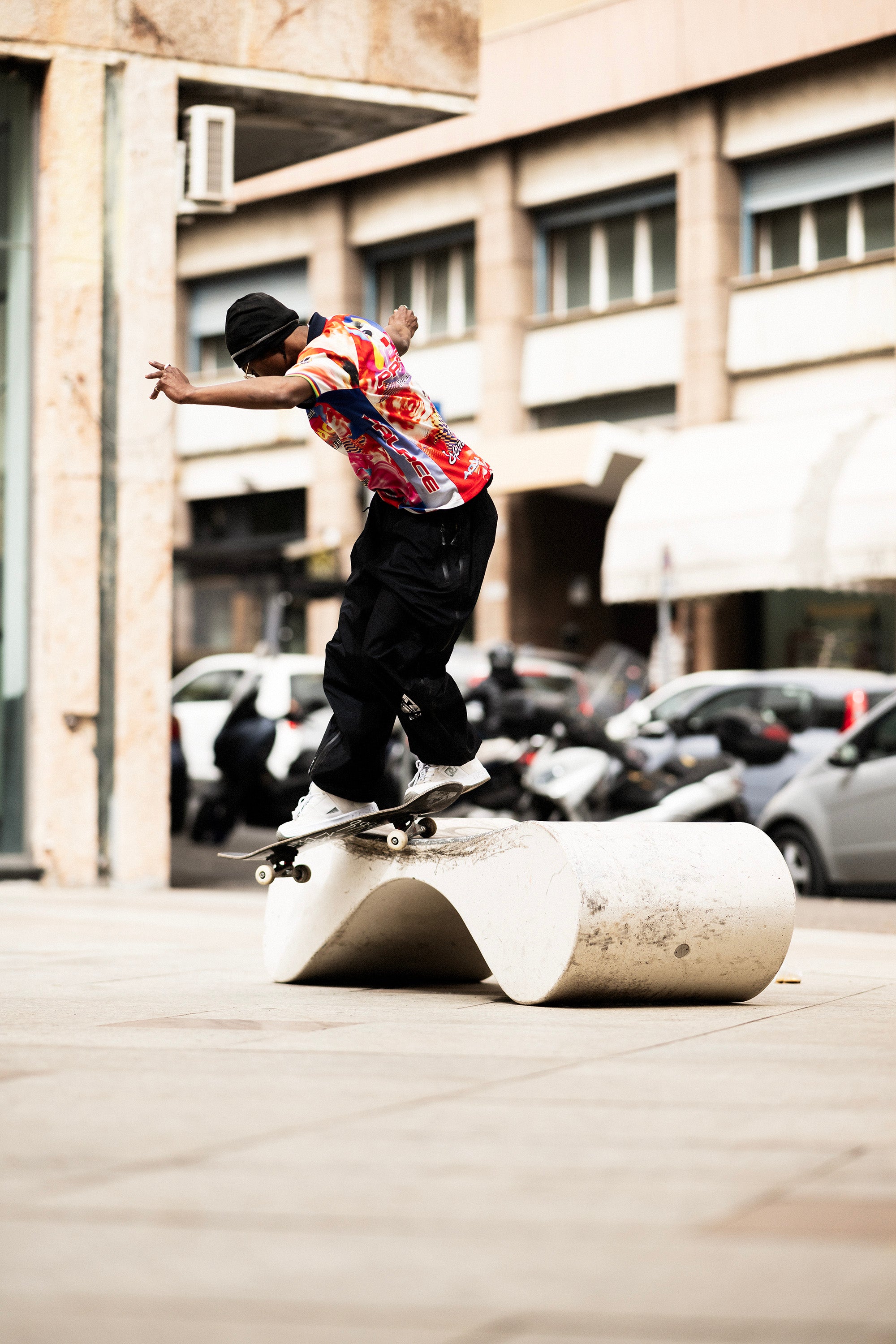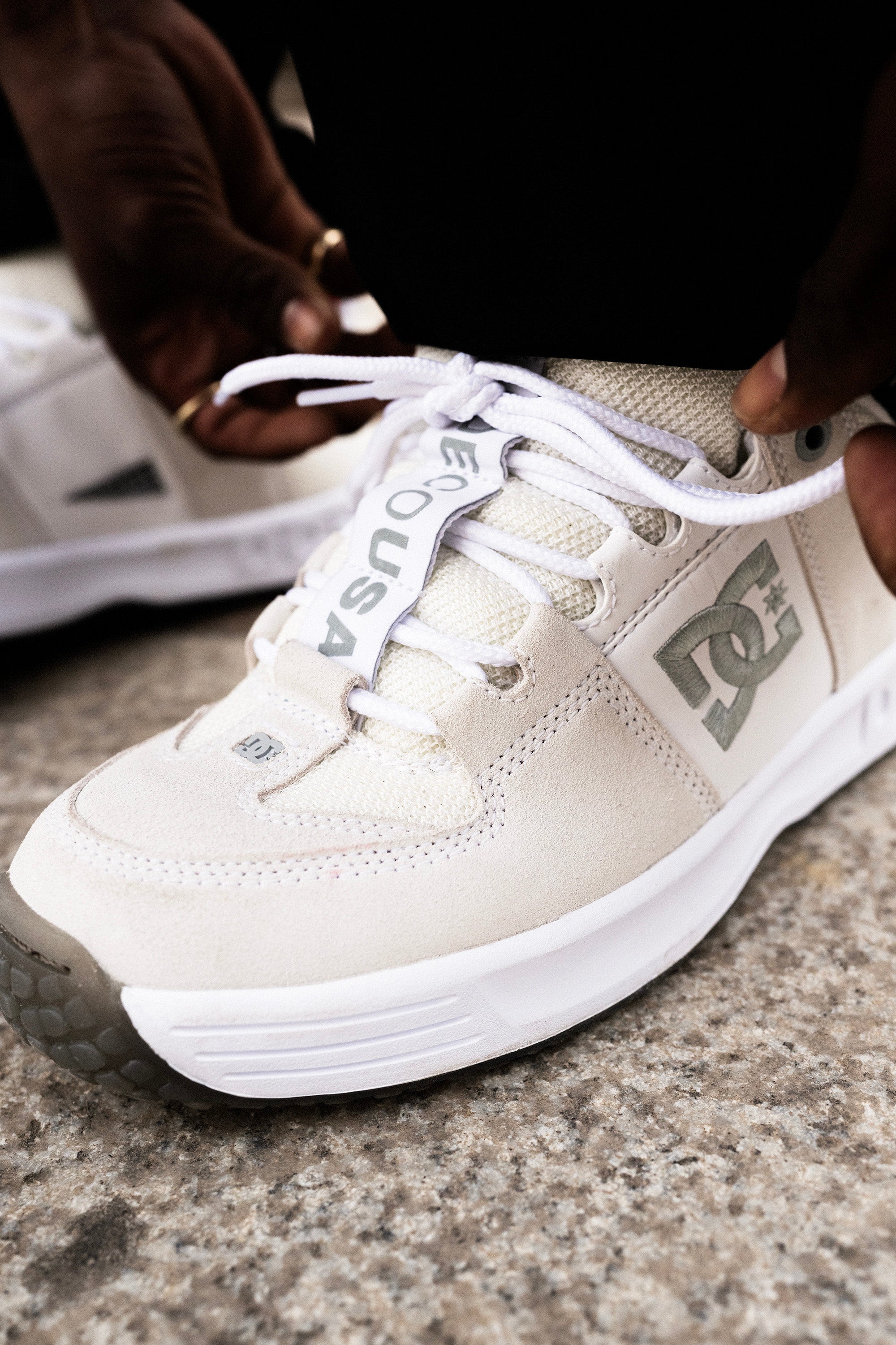 Heritage shoes in white and grey with a city background and someone doing tricks on a skateboard